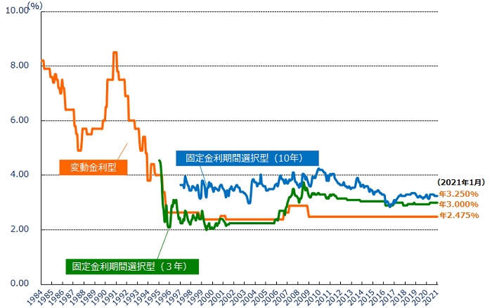 ※主要都市銀行における金利を掲載。なお、変動金利は昭和59年以降、固定金利期間選択型(3年)の金利は平成7年以降のデータを掲載。(住宅金融支援機構の資料から抜粋)