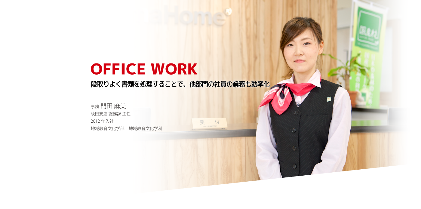 店内にお客様がいらっしゃるときは、お客様にとっても営業担当にとっても商談しやすい環境をつくることも事務の仕事です。例えば私たちがお子様の対応をすることで、商談に集中できる時間ができる。このような小さな気遣いがお客様に伝わり、帰り際に感謝の言葉をいただけると喜びを感じます。